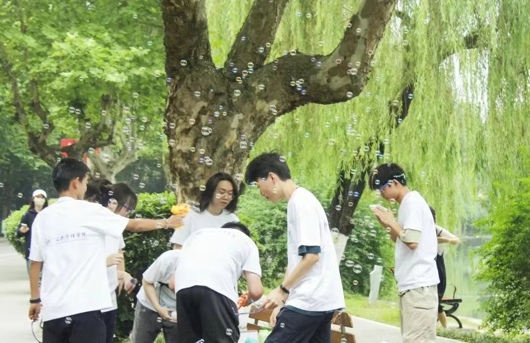 活动当天,和风习习,碧空万里,师生热情高涨。参赛者身穿学院定制T恤,头戴护目镜,在欢呼声中伴着彩带从起点冲出。本次彩虹跑里程共两公里,设有五个站点,中途设置有趣味道具供大家娱乐。当然最为激动的环节便是抛洒彩虹粉,各色的彩虹粉在校园中绽放,形成一道别样的风景线,也将活动气氛推向高潮。同学们的欢声笑语更是遍布校园每个角落,颜色碰撞汇聚成绚烂的彩虹,欢呼响起谱写出青春的赞歌。回到终点的同学们在T恤上互相写下祝福,并领取自己的定制联名可乐,欢声笑语深深印刻在每位同学的心中。