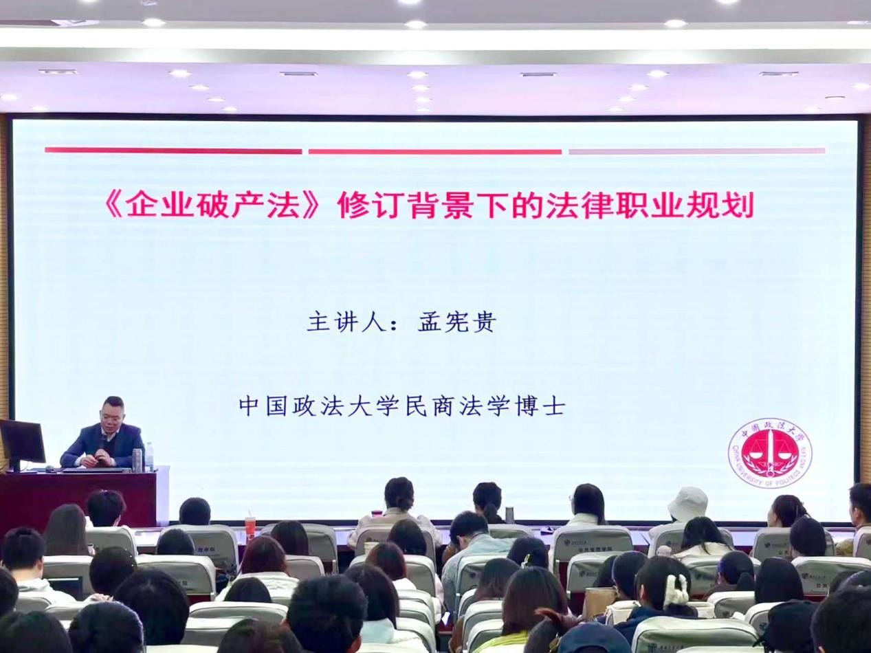 2025年12月11日15点,必赢电子游戏网站九里校区零号教学楼0231教室座无虚席,《企业破产法》修订背景下的法律职业规划专题讲座在此顺利举行。中国政法大学民商法学博士、西南交大-徐和徐破产法学研究与人才培养基地研究员孟宪贵受邀主讲,以鲜明的结构、鲜活的案例,从职业选择到法律思维,再到破产法制度未来走向,为同学们打开了一扇具有无数可能性的大门。