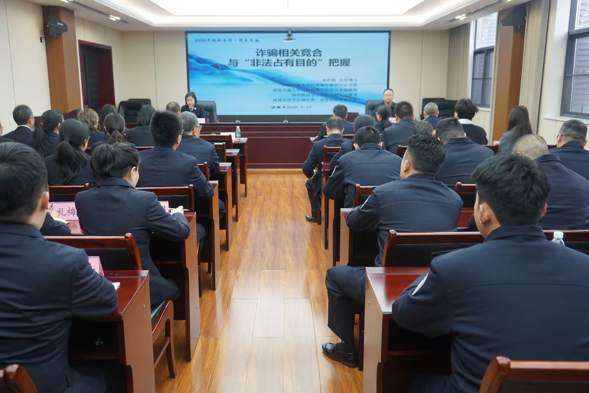 邓君韬副教授就民事欺诈行为与刑事诈骗犯罪区分以及“非法占有目的”认定问题做学术报告并与县检察院干警、县公安局代表交流。结合民法典、刑法及相关司法解释、典型案例,邓君韬指出二者存在理论与实务的界分难点,并对比有关司法解释、专家学者观点的异同;法律硕士研究生杨博宇就双方合作申报、成功立项的四川省人民检察院检察理论研究课题《刑事证明视角下涉案财物处置法律监督机制研究》作开题汇报。杨博宇代表课题组详细梳理了涉案财物范围界定、权属查明、价值认定及处置程序中的证明难题,并提出对策建议;与会检察官结合办理的非法集资案件,就涉案财物审计鉴定、跨区域协作执行、刑民交叉财产处置等问题展开交流,现场研讨气氛热烈。