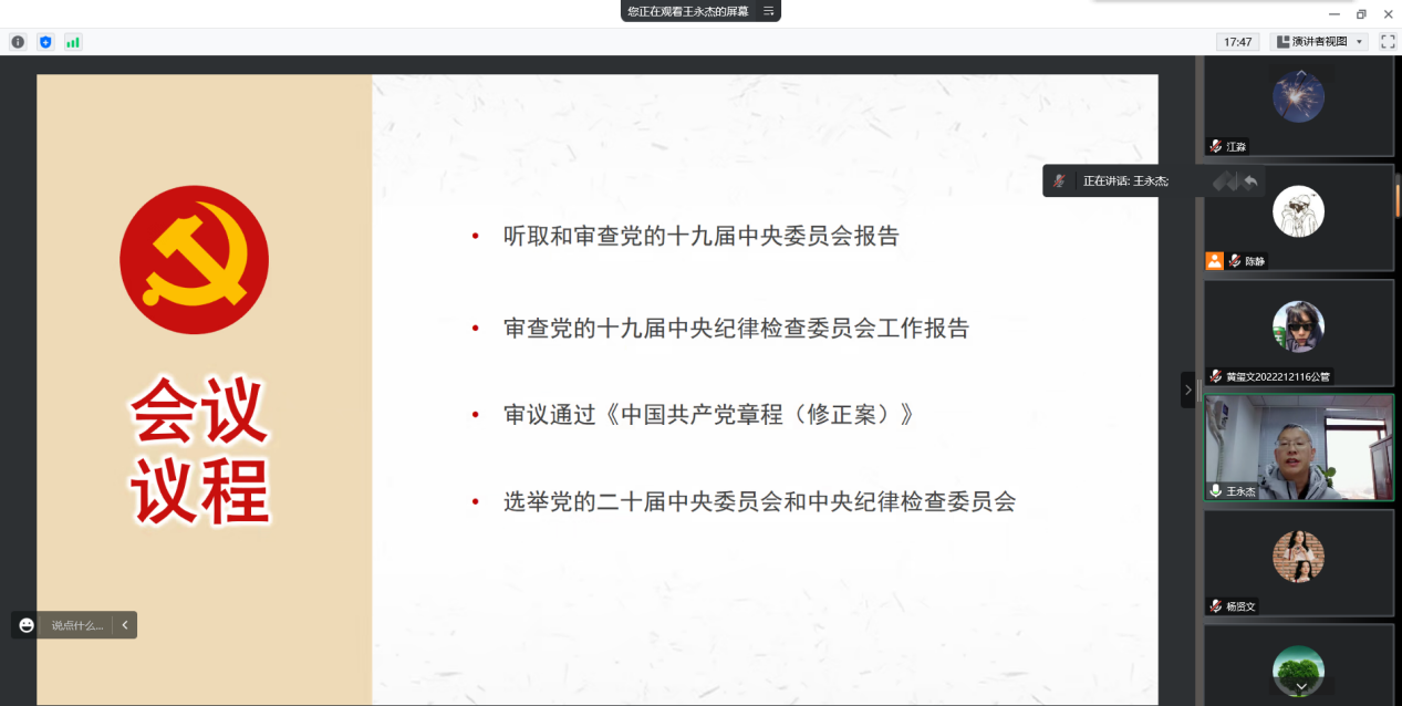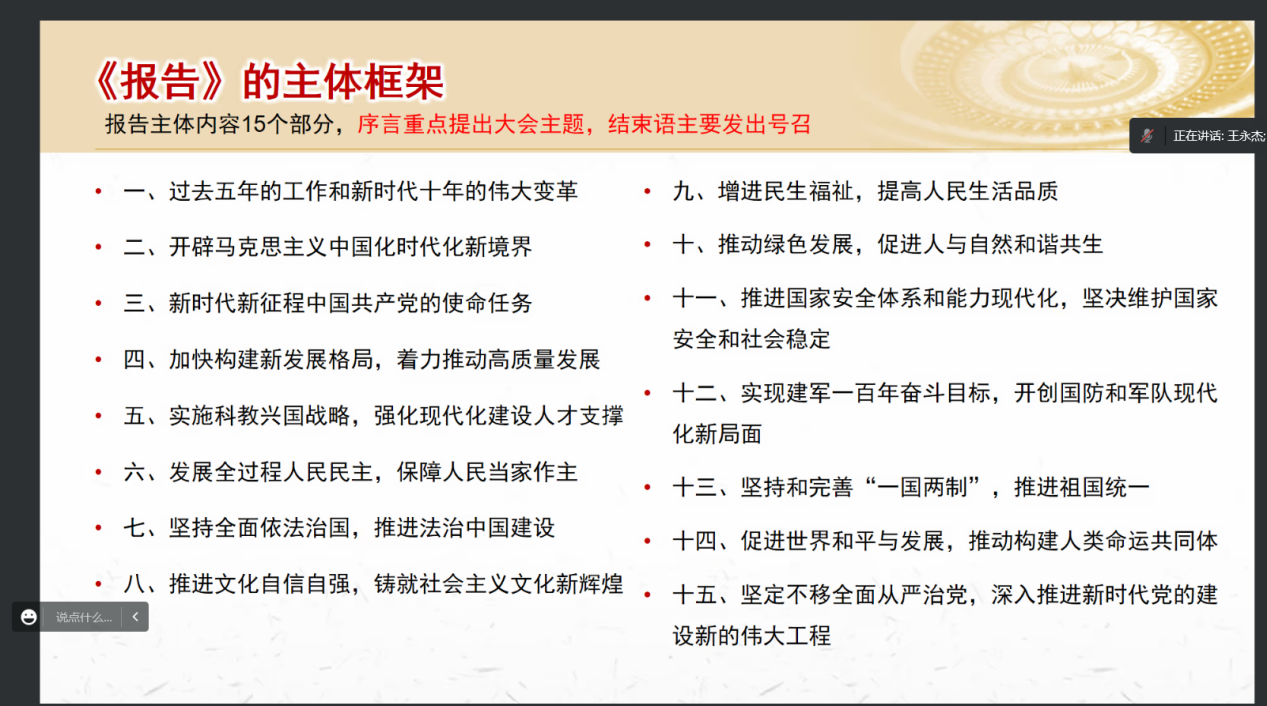 为贯彻学校《关于做好党的二十大精神学习培训的工作提示要求》,深入学习贯彻党的二十大精神,深刻回顾党和国家在发展进程中取得的重大成就,引导激励广大师生党员坚定理想信念,奋进新征程,建功新时代,2022年12月15日上午8:50,必赢电子游戏网站教工法学系党支部和硕士2022级法学第一党支部邀请学院党委委员、院长王永杰教授在腾讯会议为大家开展学习二十大专题党课宣讲活动。