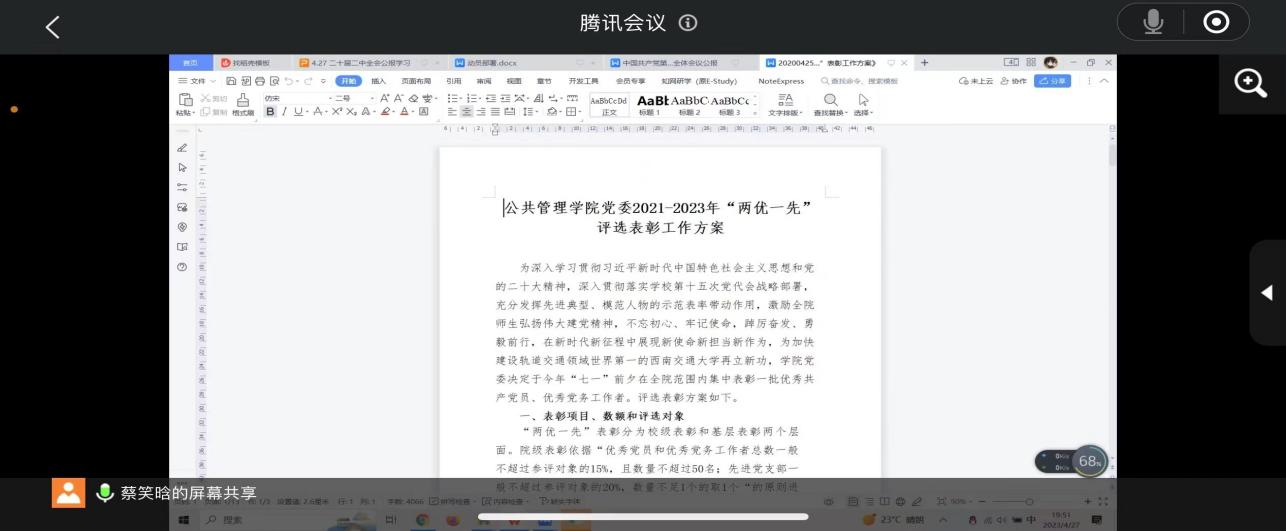 最后,进入本次党日活动的第三项议程,由蔡笑晗同志对党支部“两优一先”评选表彰工作进行部署:推荐优秀共产党员工作拟定于5月4日晚开展,她还细致向大家解读了优秀共产党员、优秀党务工作者和先进基层支部的候选名额、评选标准、注意事项和评议步骤,支部将严格按照表彰工作方案公布、党员个人申报、材料审议公开、党员大会申请人陈述、民主投票表决、结果公示、上报学院的程序开展。