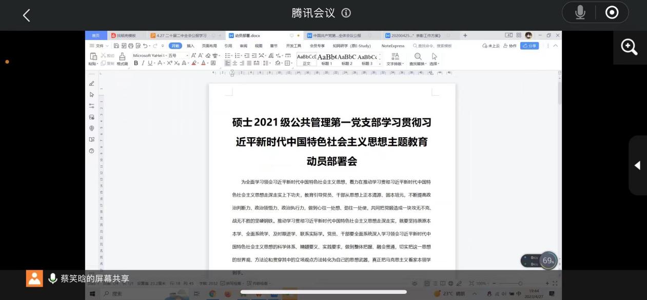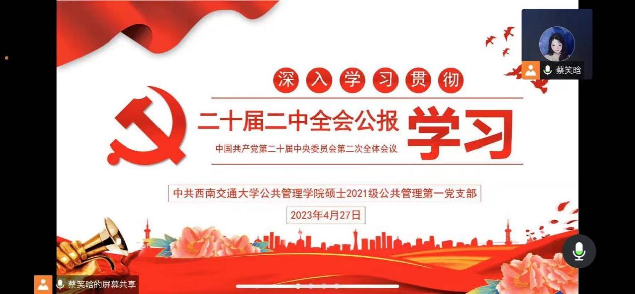 中国共产党第二十届中央委员会第二次全体会议于2023年2月26日至28日在北京举行。为深入贯彻会议精神,认真学习习近平总书记的重要讲话,硕士2021级公共管理第一党支部于2023年4月27日19:00在线上召开了以学习二十届二中全会公报为主题的党日活动,同时对接下来党支部工作和任务进行部署。