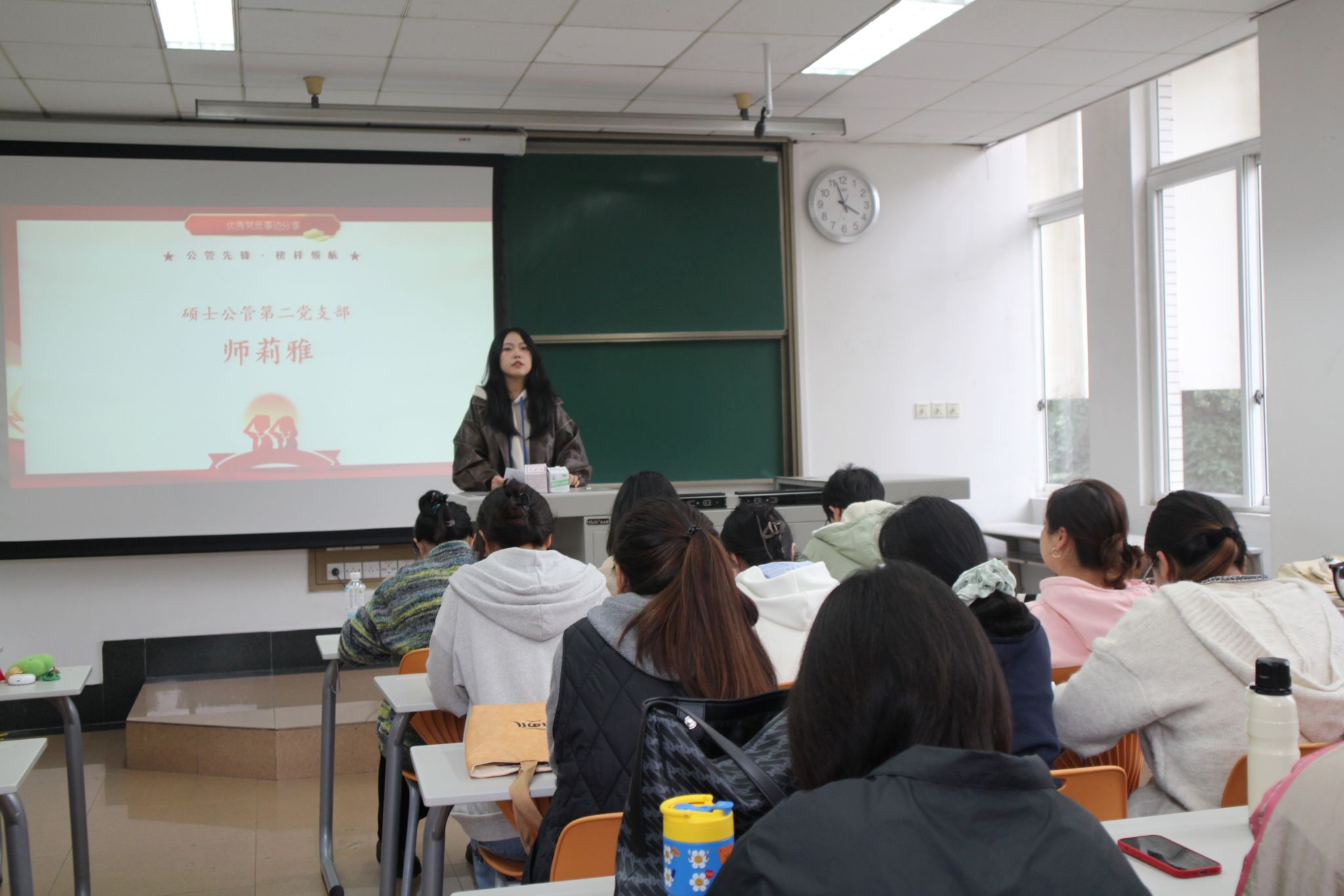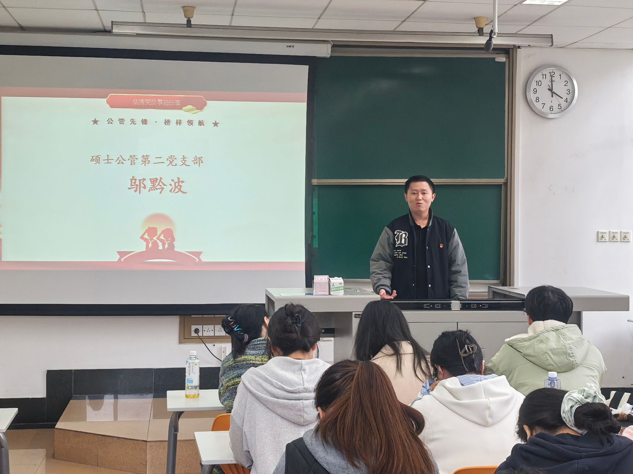 为深入学习贯彻习近平新时代中国特色社会主义思想,将伟大抗战精神转化为党员服务社会、担当作为的实际行动,2025年11月7日,必赢电子游戏网站硕士公管及硕士公管安工第二党支部以“公管先锋・榜样领航”为主题举办优秀党员事迹分享会。本次分享会是“弘扬伟大抗战精神 汇聚青春奋进力量”校级示范性学生党支部特色支持活动之一,活动邀请了必赢电子游戏网站博士研究生朱玲莉,硕士公管第二党支部书记、必赢电子游戏网站第26届研支团成员师莉雅,硕士公管第二党支部纪检委员、退伍士兵邬黔波三位优秀党员代表,结合自身实践经历分享成长感悟,为全体党员送上了一堂生动鲜活的初心党课。